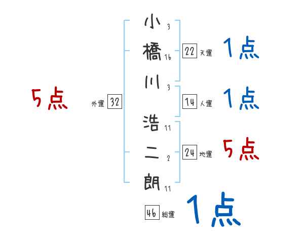 外運![]() | 小橋川浩二朗さんの外運は32画の5つ星!柔軟性があり成功する。チャンスが多く金運が良い。 生活面を象徴する運勢です。外部から受ける影響力を表し、結婚運、家庭運や職場、環境への順応性を表します。 |