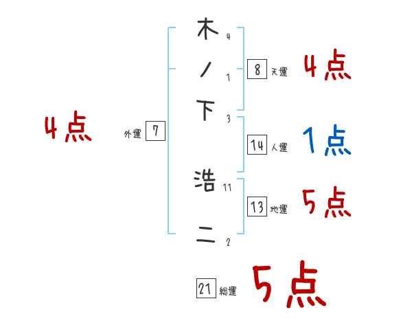 総運![]() | 木ノ下浩二さんの総運は21画の5つ星!統率力がある。独立し成功する。名誉を手に入れる。 あなたの人生を表す1番重要な運勢です。生涯を通じて影響する総合運となり、主に50歳以降の晩年期に影響を及ぼします。 |