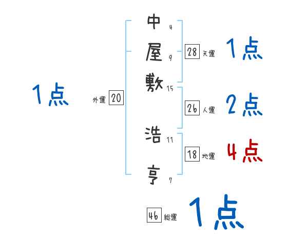 天運![]() | 中屋敷浩亨さんの天運は28画の1つ星!家庭環境に注意。スポーツで活躍できる能力があるかも。 家系が持つ宿命的な運勢を表します。祖先から受け継いだ苗字ですので自分の力が及びません。家柄を象徴します。 |