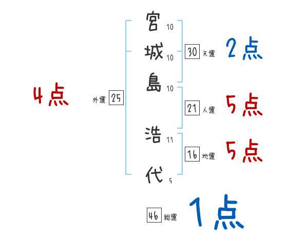 天運![]() | 宮城島浩代さんの天運は30画の2つ星!浮き沈みの激しさに注意しましょう。 家系が持つ宿命的な運勢を表します。祖先から受け継いだ苗字ですので自分の力が及びません。家柄を象徴します。 |