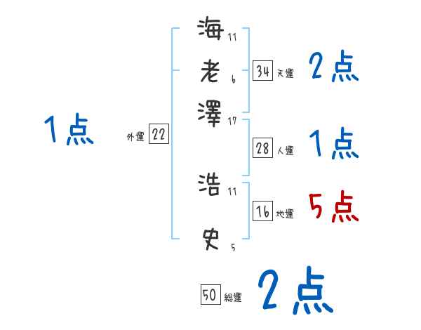 外運![]() | 海老澤浩史さんの外運は22画の1つ星!努力することが苦手ないっぽう手先が器用。芸術性にも優れる。 生活面を象徴する運勢です。外部から受ける影響力を表し、結婚運、家庭運や職場、環境への順応性を表します。 |