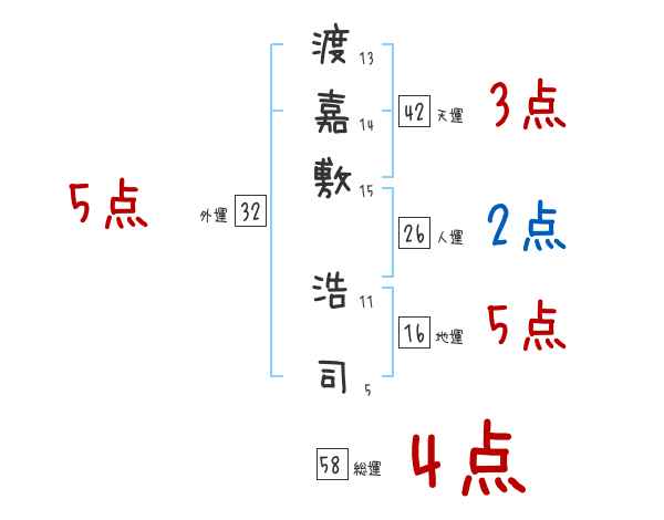 外運![]() | 渡嘉敷浩司さんの外運は32画の5つ星!柔軟性があり成功する。チャンスが多く金運が良い。 生活面を象徴する運勢です。外部から受ける影響力を表し、結婚運、家庭運や職場、環境への順応性を表します。 |