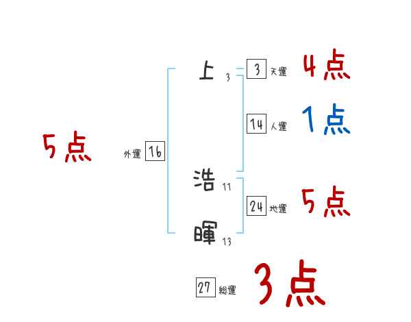 天運![]() | 上浩暉さんの天運は3画の4つ星!活動的で才能に恵まれ、多くの信頼を得る。希望に満ち成長する。 家系が持つ宿命的な運勢を表します。祖先から受け継いだ苗字ですので自分の力が及びません。家柄を象徴します。 |
