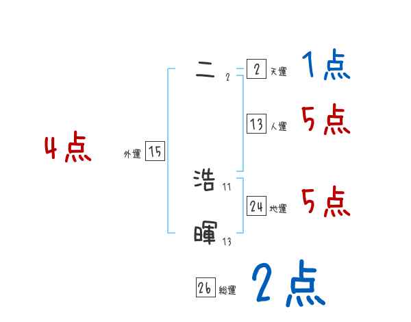 天運![]() | 二浩暉さんの天運は2画の1つ星!優しいですが積極性や意思の強さに欠ける傾向があります。家庭環境の乱れに注意しましょう。 家系が持つ宿命的な運勢を表します。祖先から受け継いだ苗字ですので自分の力が及びません。家柄を象徴します。 |