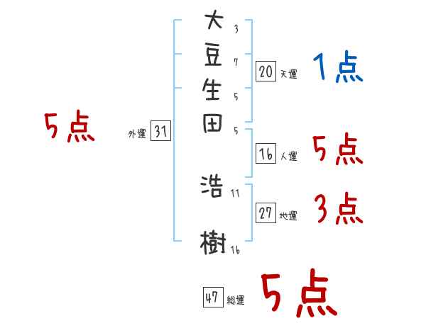 人運![]() | 大豆生田浩樹さんの人運は16画の5つ星!人望が厚く大きく発展する。逆転成功が見える。 性格や才能などを表す2番目に重要な運勢です。人間関係や協調性、社会的な成功に影響します。主に20歳から50歳ぐらいまでの中年期の運勢を表します。 |