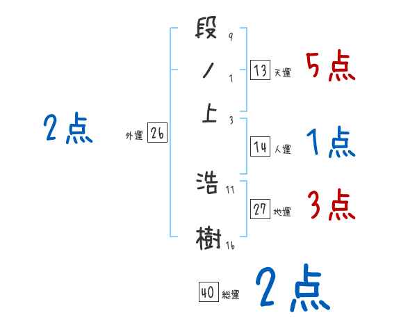 外運![]() | 段ノ上浩樹さんの外運は26画の2つ星!波瀾万丈かも。信頼できる人を大事にしましょう。 生活面を象徴する運勢です。外部から受ける影響力を表し、結婚運、家庭運や職場、環境への順応性を表します。 |