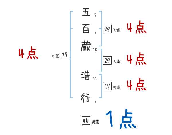 外運![]() | 五百蔵浩行さんの外運は17画の4つ星!積極的な行動力。地位を気づき財産を手に入れる。純粋な心と直感力。 生活面を象徴する運勢です。外部から受ける影響力を表し、結婚運、家庭運や職場、環境への順応性を表します。 |