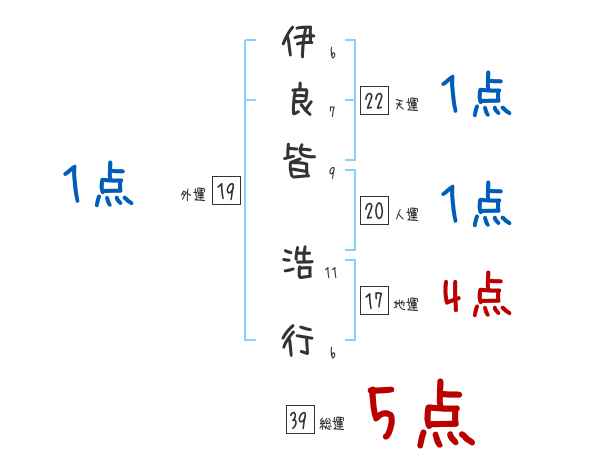 天運![]() | 伊良皆浩行さんの天運は22画の1つ星!努力することが苦手ないっぽう手先が器用。芸術性にも優れる。 家系が持つ宿命的な運勢を表します。祖先から受け継いだ苗字ですので自分の力が及びません。家柄を象徴します。 |
