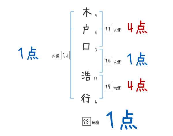 天運![]() | 木戸口浩行さんの天運は11画の4つ星!着実に富や地位を得る幸運な人生。 家系が持つ宿命的な運勢を表します。祖先から受け継いだ苗字ですので自分の力が及びません。家柄を象徴します。 |