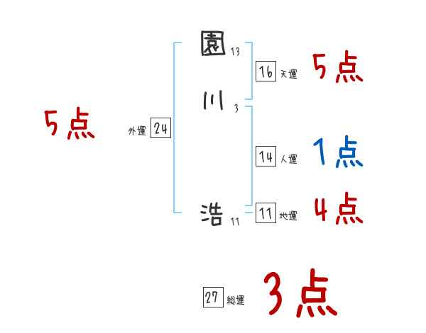 天運![]() | 園川浩さんの天運は16画の5つ星!人望が厚く大きく発展する。逆転成功が見える。 家系が持つ宿命的な運勢を表します。祖先から受け継いだ苗字ですので自分の力が及びません。家柄を象徴します。 |