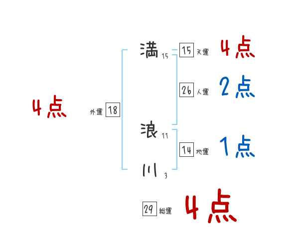 外運![]() | 満浪川さんの外運は18画の4つ星!情熱的で剛気。忍耐力があり信頼される。 生活面を象徴する運勢です。外部から受ける影響力を表し、結婚運、家庭運や職場、環境への順応性を表します。 |