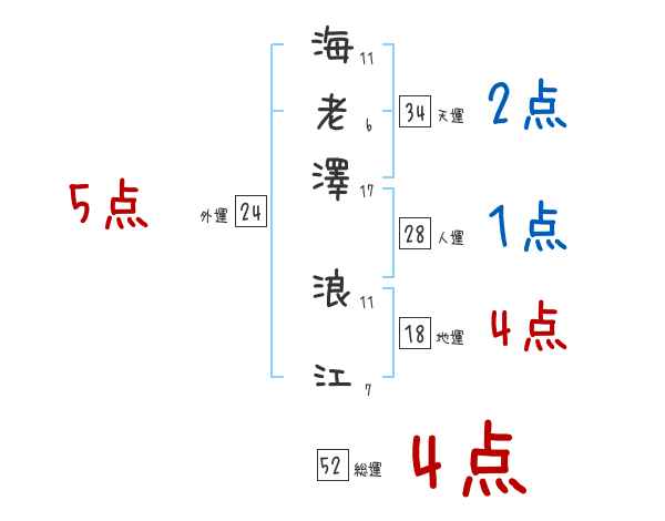 外運![]() | 海老澤浪江さんの外運は24画の5つ星!家庭運が良く順調な人生。金運にも恵まれる。 生活面を象徴する運勢です。外部から受ける影響力を表し、結婚運、家庭運や職場、環境への順応性を表します。 |