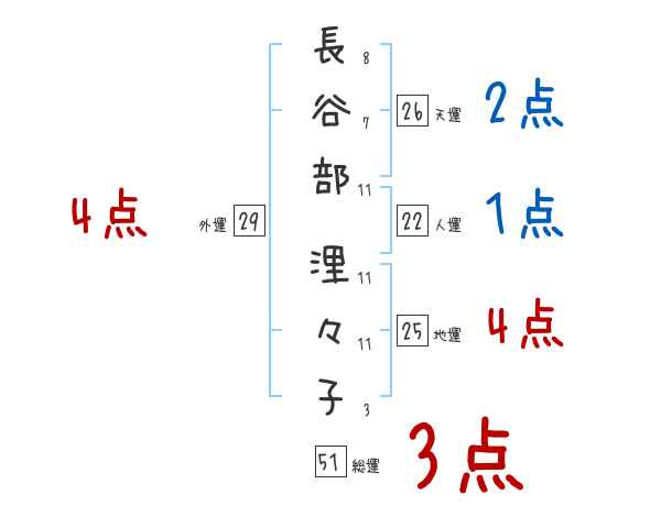 総運![]() | 長谷部浬々子さんの総運は51画の3つ星!変化が激しく、危険に注意。堅実な性格。 あなたの人生を表す1番重要な運勢です。生涯を通じて影響する総合運となり、主に50歳以降の晩年期に影響を及ぼします。 |