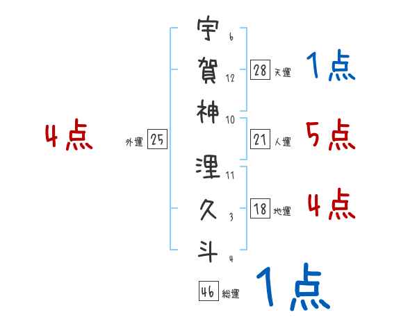 | 天運  | 宇賀神浬久斗さんの天運は28画の1つ星!家庭環境に注意。スポーツで活躍できる能力があるかも。家系が持つ宿命的な運勢を表します。祖先から受け継いだ苗字ですので自分の力が及びません。家柄を象徴します。 |