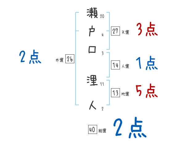 天運![]() | 瀬戸口浬人さんの天運は27画の3つ星!頭脳明晰だが強情で摩擦が多い傾向。孤立に注意。 家系が持つ宿命的な運勢を表します。祖先から受け継いだ苗字ですので自分の力が及びません。家柄を象徴します。 |