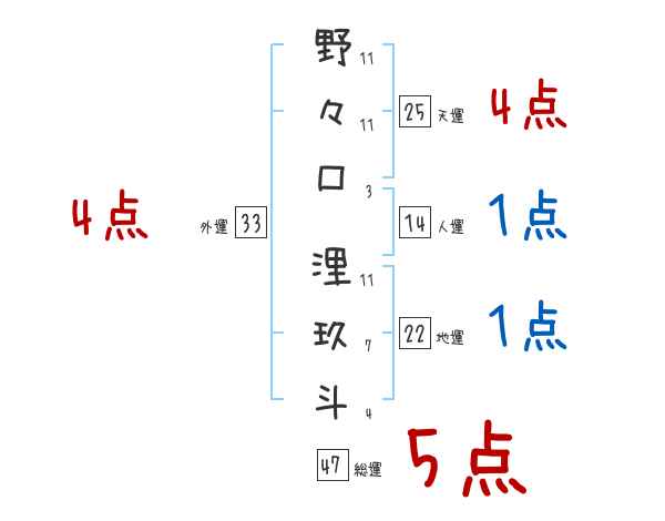 天運![]() | 野々口浬玖斗さんの天運は25画の4つ星!個性があり才能があふれる。強運の持ち主で発展する。 家系が持つ宿命的な運勢を表します。祖先から受け継いだ苗字ですので自分の力が及びません。家柄を象徴します。 |