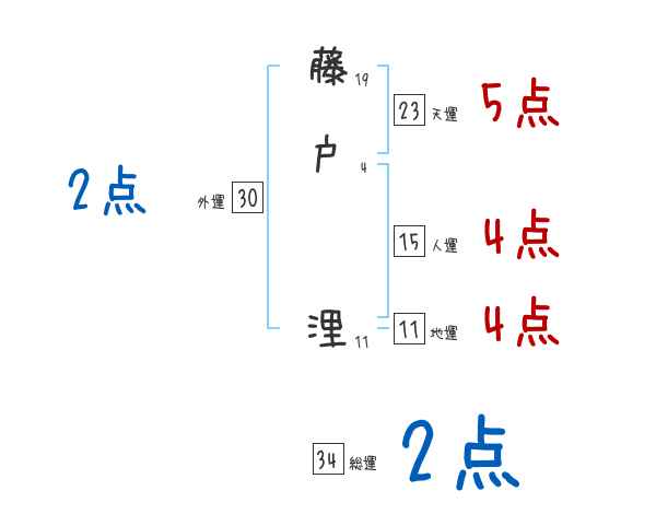 総運![]() | 藤戸浬さんの総運は34画の2つ星!独創性に優れるが、自尊心が強く災難に注意しましょう。 あなたの人生を表す1番重要な運勢です。生涯を通じて影響する総合運となり、主に50歳以降の晩年期に影響を及ぼします。 |