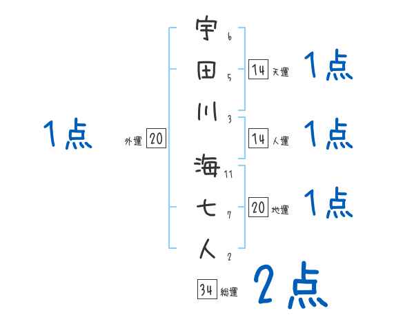 天運![]() | 宇田川海七人さんの天運は14画の1つ星!人に対して優しいがストレスを溜め込みがち。人間関係のトラブルを避けるよう気をつけましょう。 家系が持つ宿命的な運勢を表します。祖先から受け継いだ苗字ですので自分の力が及びません。家柄を象徴します。 |