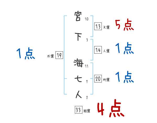 外運![]() | 宮下海七人さんの外運は19画の1つ星!優れた才能を持ちますが、協調性が足りないことも。周りの人と協力する事を意識しましょう。 生活面を象徴する運勢です。外部から受ける影響力を表し、結婚運、家庭運や職場、環境への順応性を表します。 |