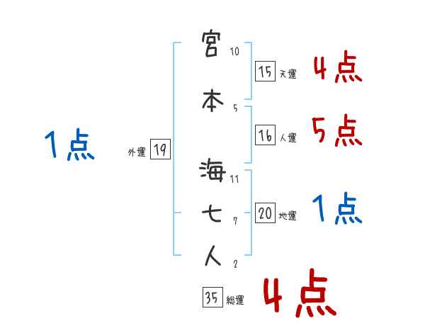 外運![]() | 宮本海七人さんの外運は19画の1つ星!優れた才能を持ちますが、協調性が足りないことも。周りの人と協力する事を意識しましょう。 生活面を象徴する運勢です。外部から受ける影響力を表し、結婚運、家庭運や職場、環境への順応性を表します。 |