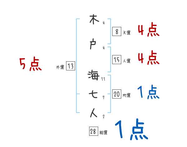 総運![]() | 木戸海七人さんの総運は28画の1つ星!家庭環境に注意。スポーツで活躍できる能力があるかも。 あなたの人生を表す1番重要な運勢です。生涯を通じて影響する総合運となり、主に50歳以降の晩年期に影響を及ぼします。 |