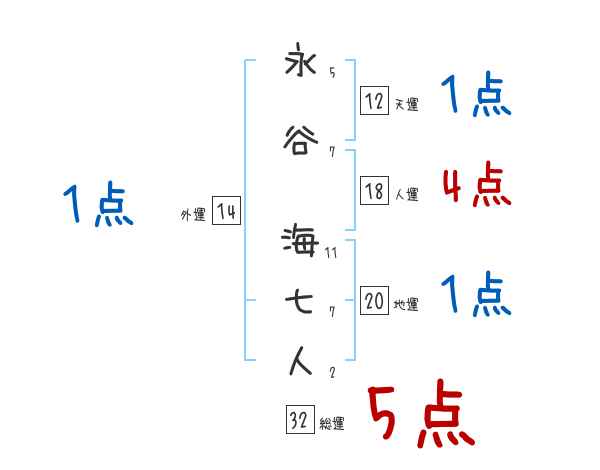 総運![]() | 永谷海七人さんの総運は32画の5つ星!柔軟性があり成功する。チャンスが多く金運が良い。 あなたの人生を表す1番重要な運勢です。生涯を通じて影響する総合運となり、主に50歳以降の晩年期に影響を及ぼします。 |