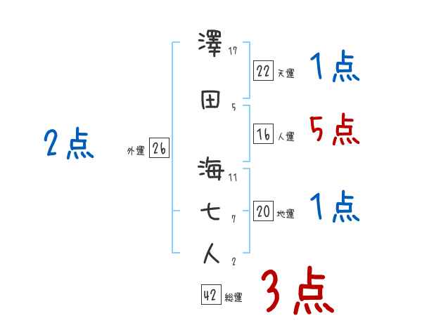 人運![]() | 澤田海七人さんの人運は16画の5つ星!人望が厚く大きく発展する。逆転成功が見える。 性格や才能などを表す2番目に重要な運勢です。人間関係や協調性、社会的な成功に影響します。主に20歳から50歳ぐらいまでの中年期の運勢を表します。 |