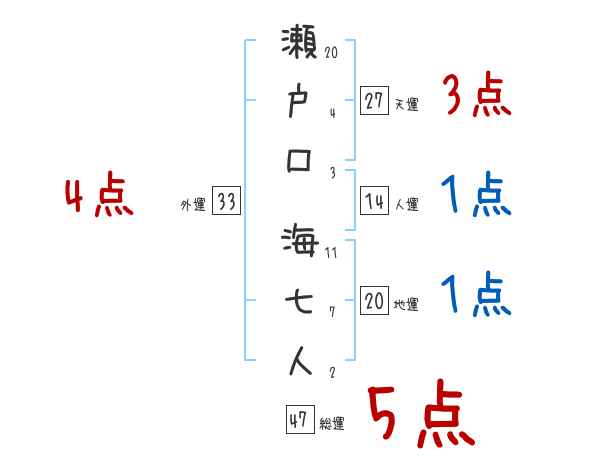 天運![]()  | 瀬戸口海七人さんの天運は27画の3つ星!頭脳明晰だが強情で摩擦が多い傾向。孤立に注意。 家系が持つ宿命的な運勢を表します。祖先から受け継いだ苗字ですので自分の力が及びません。家柄を象徴します。 |
