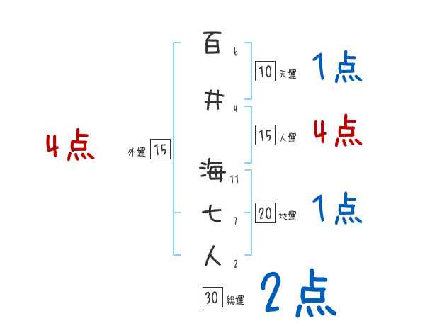天運![]() | 百井海七人さんの天運は10画の1つ星!不安を感じやすい傾向。ストレスを抱えないように注意しましょう。 家系が持つ宿命的な運勢を表します。祖先から受け継いだ苗字ですので自分の力が及びません。家柄を象徴します。 |