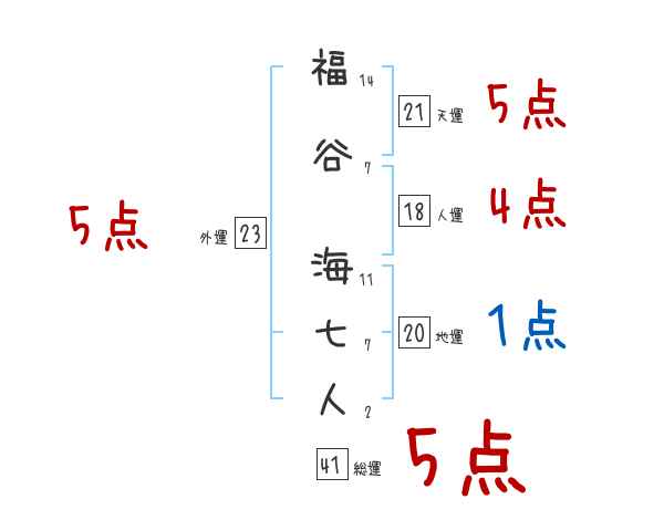 天運![]() | 福谷海七人さんの天運は21画の5つ星!統率力がある。独立し成功する。名誉を手に入れる。 家系が持つ宿命的な運勢を表します。祖先から受け継いだ苗字ですので自分の力が及びません。家柄を象徴します。 |