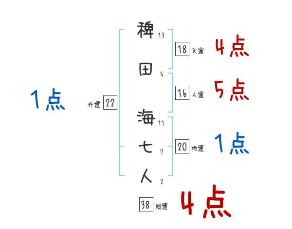 人運![]() | 稗田海七人さんの人運は16画の5つ星!人望が厚く大きく発展する。逆転成功が見える。 性格や才能などを表す2番目に重要な運勢です。人間関係や協調性、社会的な成功に影響します。主に20歳から50歳ぐらいまでの中年期の運勢を表します。 |