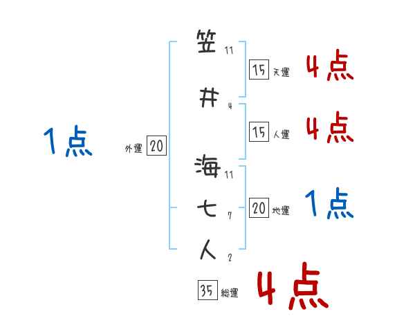 総運![]() | 笠井海七人さんの総運は35画の4つ星!温厚な性格で感受性が高い。穏和な性格で人望が厚い。 あなたの人生を表す1番重要な運勢です。生涯を通じて影響する総合運となり、主に50歳以降の晩年期に影響を及ぼします。 |