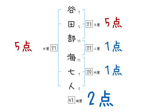 天運![]()  | 谷田部海七人さんの天運は23画の5つ星!想像力に優れ活力がある。一代で成功し名誉を手に入れる。 家系が持つ宿命的な運勢を表します。祖先から受け継いだ苗字ですので自分の力が及びません。家柄を象徴します。 |