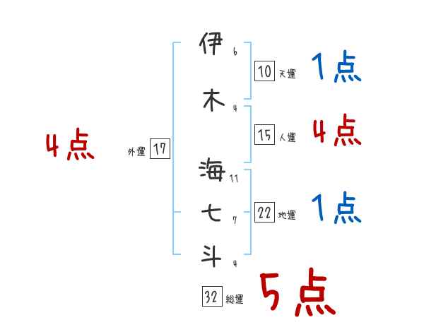総運![]() | 伊木海七斗さんの総運は32画の5つ星!柔軟性があり成功する。チャンスが多く金運が良い。 あなたの人生を表す1番重要な運勢です。生涯を通じて影響する総合運となり、主に50歳以降の晩年期に影響を及ぼします。 |