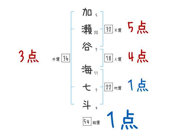 天運![]() | 加瀬谷海七斗さんの天運は32画の5つ星!柔軟性があり成功する。チャンスが多く金運が良い。 家系が持つ宿命的な運勢を表します。祖先から受け継いだ苗字ですので自分の力が及びません。家柄を象徴します。 |