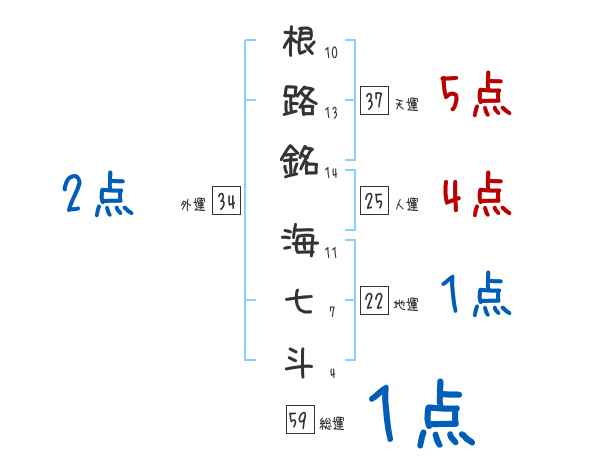 地運![]() | 根路銘海七斗さんの地運は22画の1つ星!努力することが苦手ないっぽう手先が器用。芸術性にも優れる。 個性を表す基礎的な運勢です。性格形成や対人関係、行動力など家庭環境に影響されます。主に誕生してから20歳くらいまでの若年期の運勢を表します。 |