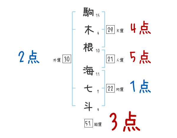総運![]() | 駒木根海七斗さんの総運は51画の3つ星!変化が激しく、危険に注意。堅実な性格。 あなたの人生を表す1番重要な運勢です。生涯を通じて影響する総合運となり、主に50歳以降の晩年期に影響を及ぼします。 |