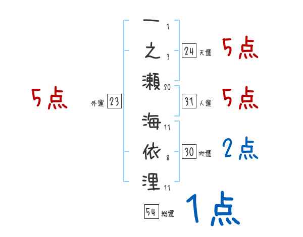 外運![]() | 一之瀬海依浬さんの外運は23画の5つ星!想像力に優れ活力がある。一代で成功し名誉を手に入れる。 生活面を象徴する運勢です。外部から受ける影響力を表し、結婚運、家庭運や職場、環境への順応性を表します。 |