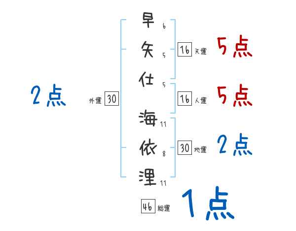 天運![]() | 早矢仕海依浬さんの天運は16画の5つ星!人望が厚く大きく発展する。逆転成功が見える。 家系が持つ宿命的な運勢を表します。祖先から受け継いだ苗字ですので自分の力が及びません。家柄を象徴します。 |