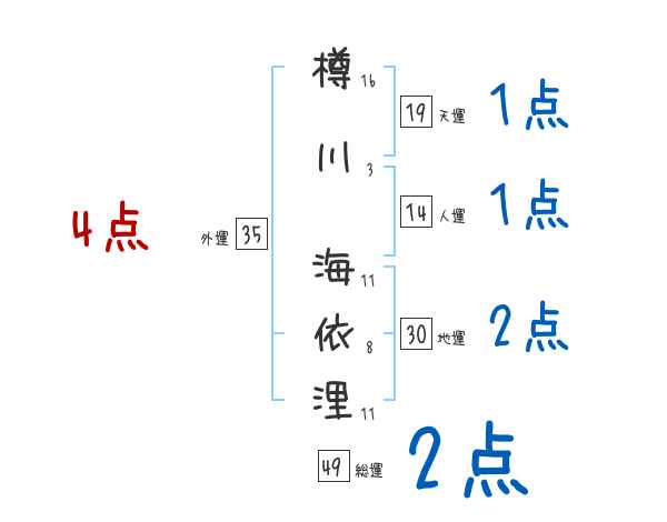 外運![]() | 樽川海依浬さんの外運は35画の4つ星!温厚な性格で感受性が高い。穏和な性格で人望が厚い。 生活面を象徴する運勢です。外部から受ける影響力を表し、結婚運、家庭運や職場、環境への順応性を表します。 |