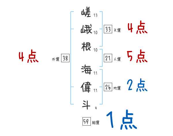 総運![]() | 嵯峨根海偉斗さんの総運は59画の1つ星!意志の弱さであきらめることが多いかも。粘り強さが必要。 あなたの人生を表す1番重要な運勢です。生涯を通じて影響する総合運となり、主に50歳以降の晩年期に影響を及ぼします。 |