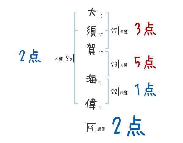 外運![]() | 大須賀海偉さんの外運は26画の2つ星!波瀾万丈かも。信頼できる人を大事にしましょう。 生活面を象徴する運勢です。外部から受ける影響力を表し、結婚運、家庭運や職場、環境への順応性を表します。 |