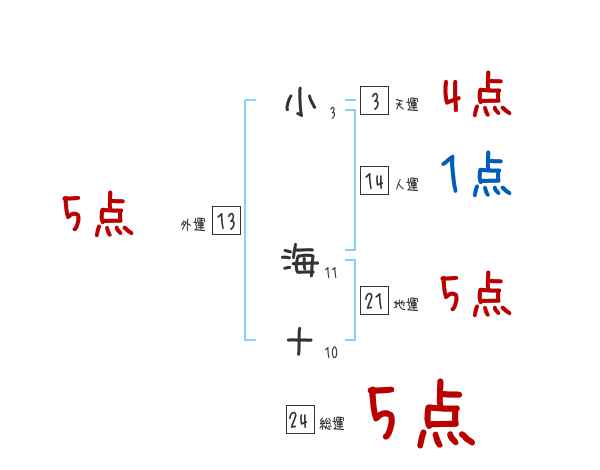 総運![]() | 小海十さんの総運は24画の5つ星!家庭運が良く順調な人生。金運にも恵まれる。 あなたの人生を表す1番重要な運勢です。生涯を通じて影響する総合運となり、主に50歳以降の晩年期に影響を及ぼします。 |