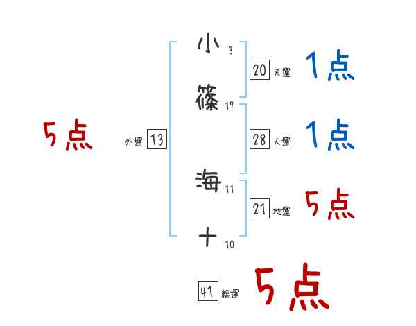外運![]() | 小篠海十さんの外運は13画の5つ星!才能に恵まれ人気がある。名声を手に入れる。円満な人生。 生活面を象徴する運勢です。外部から受ける影響力を表し、結婚運、家庭運や職場、環境への順応性を表します。 |