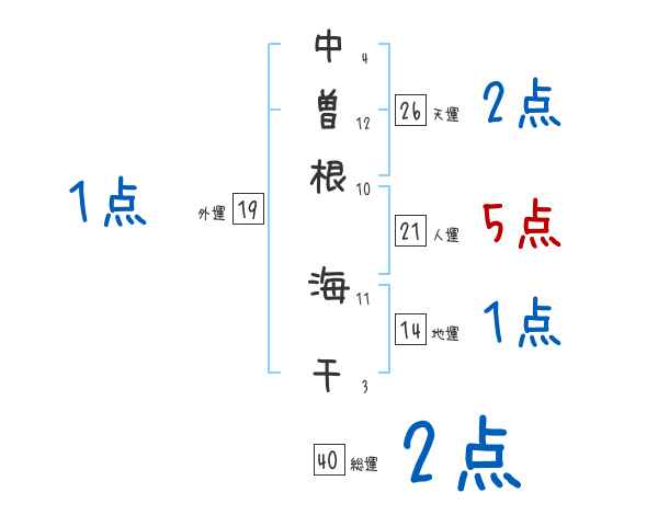外運![]() | 中曽根海千さんの外運は19画の1つ星!優れた才能を持ちますが、協調性が足りないことも。周りの人と協力する事を意識しましょう。 生活面を象徴する運勢です。外部から受ける影響力を表し、結婚運、家庭運や職場、環境への順応性を表します。 |