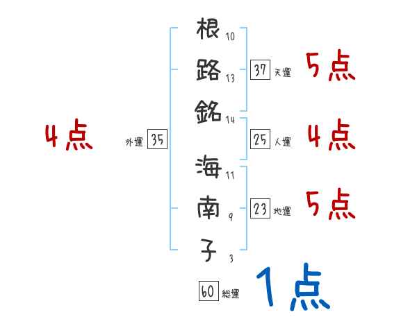 総運![]() | 根路銘海南子さんの総運は60画の1つ星!悲観的で迷いやすい。波乱が多く損をしないように。 あなたの人生を表す1番重要な運勢です。生涯を通じて影響する総合運となり、主に50歳以降の晩年期に影響を及ぼします。 |