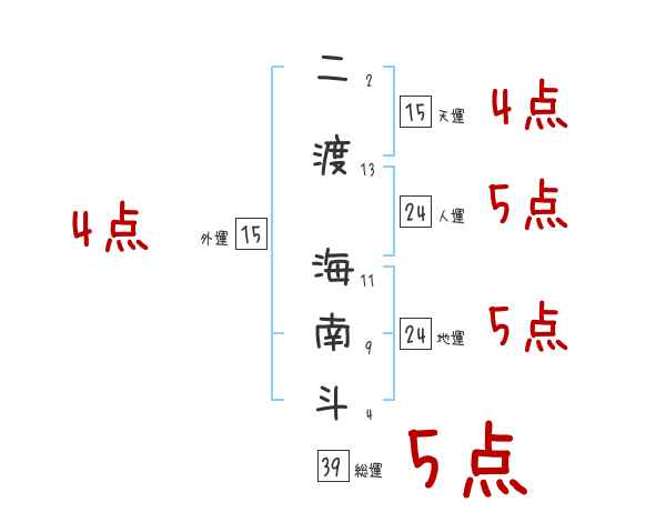 天運![]() | 二渡海南斗さんの天運は15画の4つ星!人徳があり出世する。順調に物事を進め円満な人生。 家系が持つ宿命的な運勢を表します。祖先から受け継いだ苗字ですので自分の力が及びません。家柄を象徴します。 |