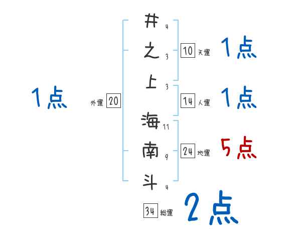 総運![]() | 井之上海南斗さんの総運は34画の2つ星!独創性に優れるが、自尊心が強く災難に注意しましょう。 あなたの人生を表す1番重要な運勢です。生涯を通じて影響する総合運となり、主に50歳以降の晩年期に影響を及ぼします。 |