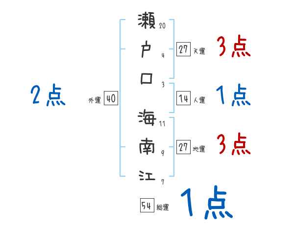 天運![]() | 瀬戸口海南江さんの天運は27画の3つ星!頭脳明晰だが強情で摩擦が多い傾向。孤立に注意。 家系が持つ宿命的な運勢を表します。祖先から受け継いだ苗字ですので自分の力が及びません。家柄を象徴します。 |