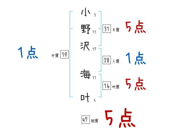 外運![]() | 小野沢海叶さんの外運は19画の1つ星!優れた才能を持ちますが、協調性が足りないことも。周りの人と協力する事を意識しましょう。 生活面を象徴する運勢です。外部から受ける影響力を表し、結婚運、家庭運や職場、環境への順応性を表します。 |
